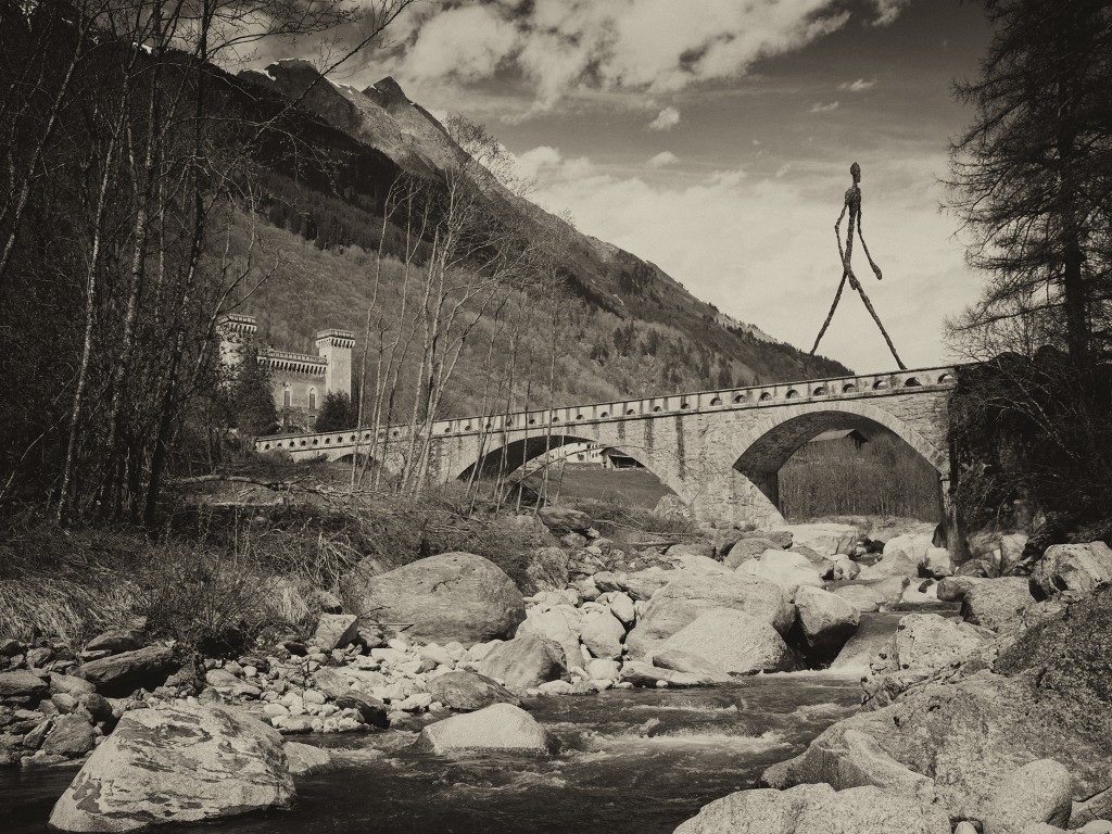 Hommage an Alberto Giacometti und seine berühmteste Skulptur. Brücke über die Maira von Castelmur/Coltura nach Stampa, 2015