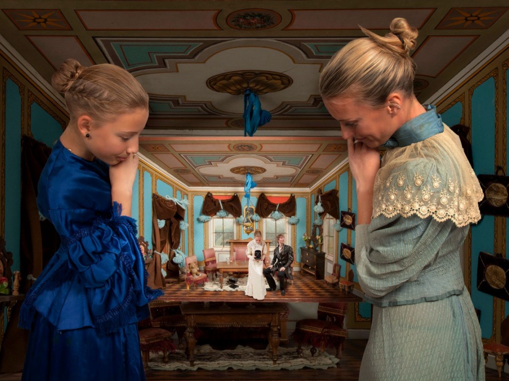 Die alte Puppenstube aus dem 19. Jahrhundert wird zur photographischen “poupée russe” - die Darsteller in Originalkostümen der Belle Epoque befinden sich selbst in den verschiedenen Dimensionen von Gross und Klein. Das junge Mädchen im Zentrum “fotografiert” den Betrachter mit einer historischen Kamera der englischen Alpenfotografin Elisabeth Main