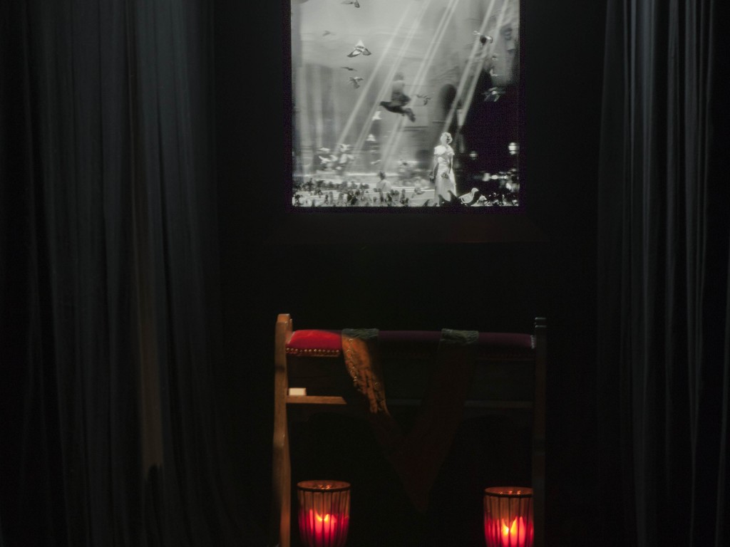 Lentikularbild mit originalen Gebetsbank aus der Kirche von St. Moritz