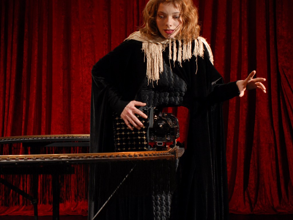Illusion faisant parti de son spectacle "L'Oratorio d'Aurelia" mis en scène par sa mère Victoria Thierrée-Chaplin : un petit train tourne en rond en traversant le corps de l'actrice.