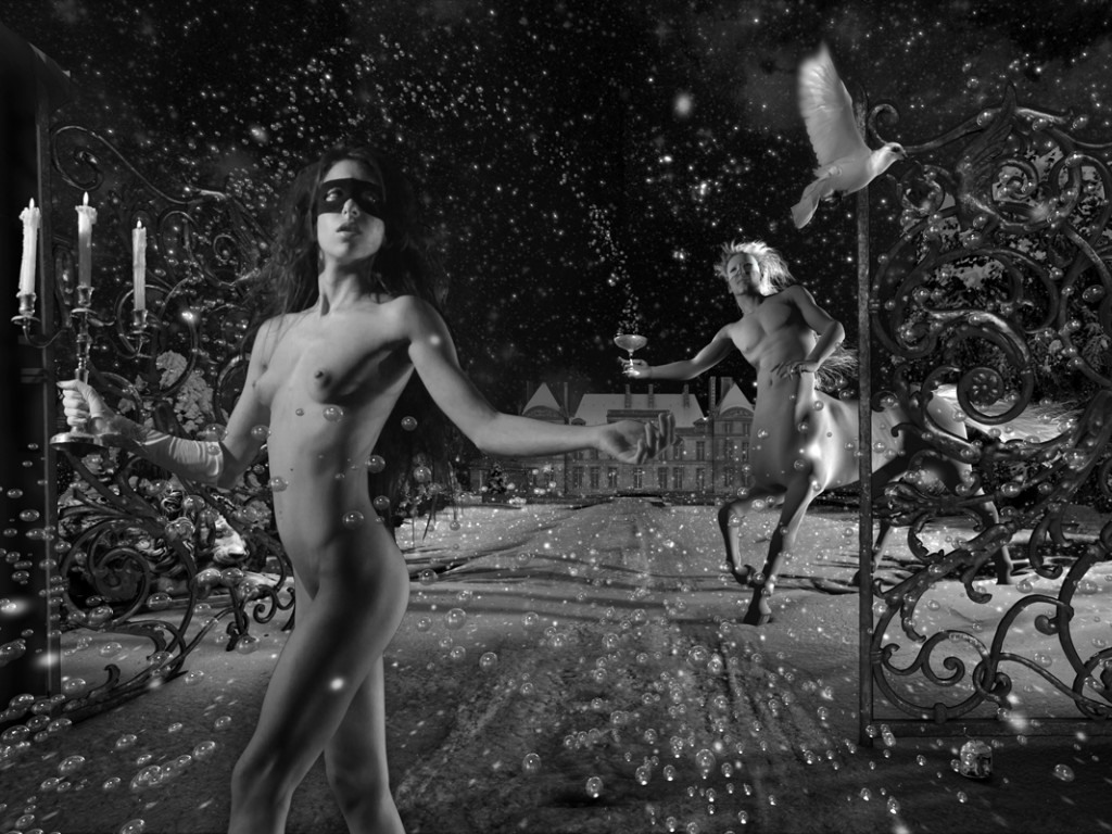 Scène mythologique hivernale dans le parc nocturne du château de Raray dans l'Oise (tournage "La Belle et la Bête" de Jean Cocteau)
