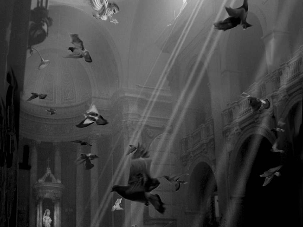 Unten rechts, inmitten von betenden Menschen und sich dicht in die Bänke drängelnder Tauben steht bildbestimmend eine weißgekleidete weibliche Figur, Kinderpuppen in ihren herabhängenden Händen haltend, in die Höhe schauend und umgeben von flatternden Vögeln. Im Hintergrund links scheint sich das Mädchen in der Skulptur der Muttergottes zu spiegeln. Von ganz oben, aus der Kuppel, stößt eine große Eule nach unten, beleuchtet von einer Lichtquelle oben außerhalb des sichtbaren Bildes, vermutlich direkt auf die weiße Figur zu.
