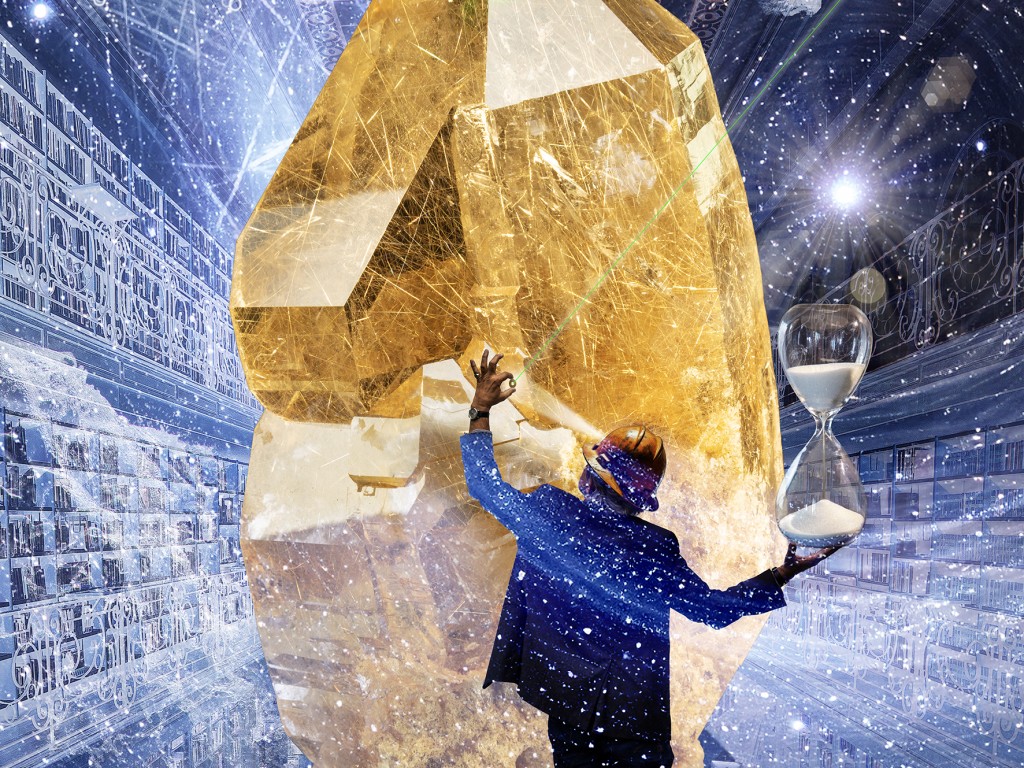 Résumée: À l’occasion de l’inauguration du projet « Grand Quartz », la photo-composition « Der Zeitenwanderer » (Le voyageur des temps) de Mark Blezinger conte les grands thèmes de ce voyage de découverte scientifique de l’homme à travers les siècles autour d’un majestueux quartz de couleur doré du Brésil, exposé au musée de minéralogie de l’école des mines flottant ici au centre d’un univers bleu profond. Des inclusions de rutiles confèrent à ce minéral une richesse intérieure particulière. Des éléments géométriques lui apportent une structure transparente dans laquelle la lumière développe ses innombrables rayons à travers le cosmos.